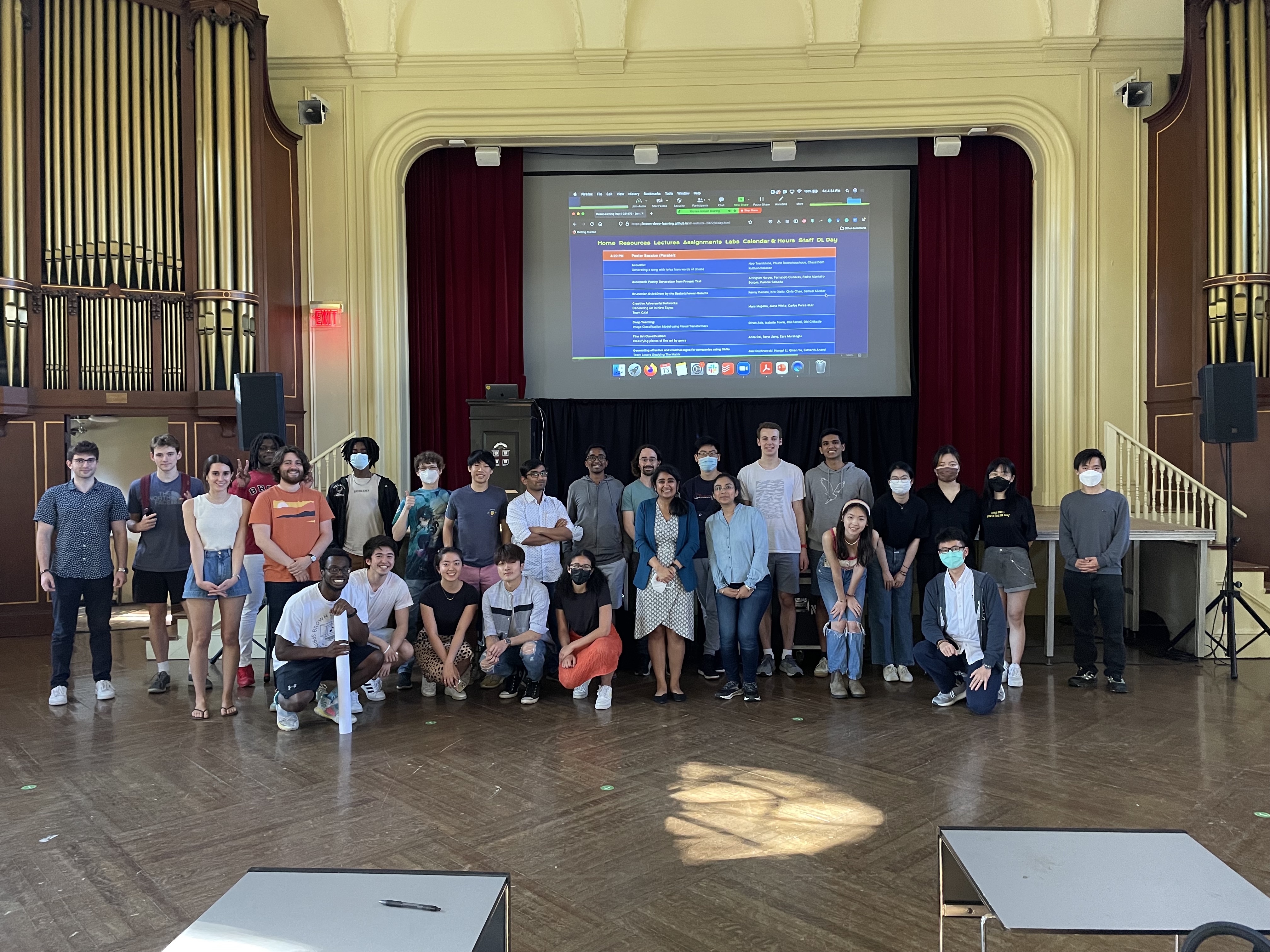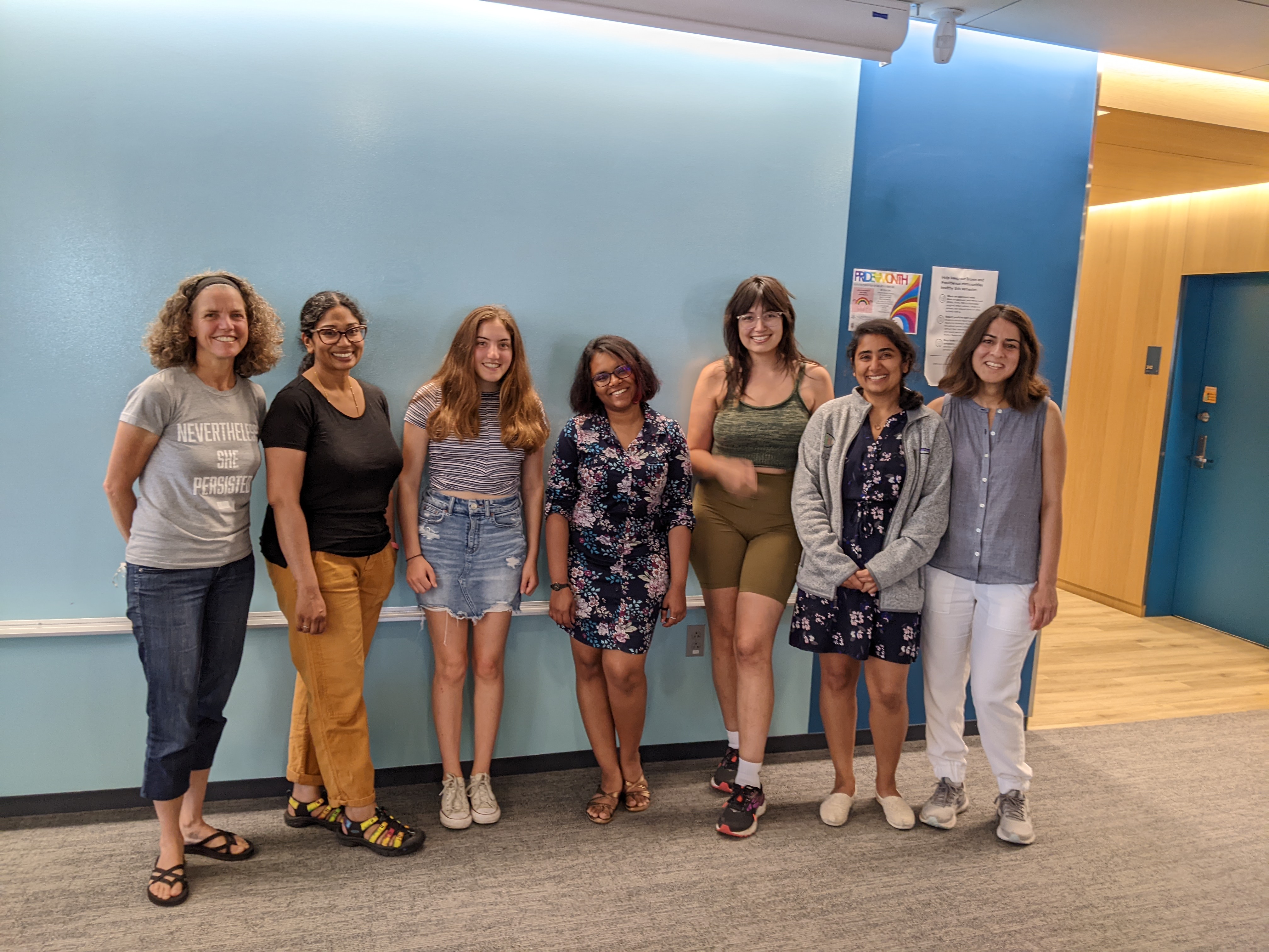 The awesome DSI/CCMB space (Summer 2022): (L-R) Amy Greenwald, Sohini Ramachandran, Carmen Boyan (High school student researcher in Singh Lab), Marilyn George, Lizzie Kumar, Ritambhara Singh, and Shahrzad Haddadan #womeninCS