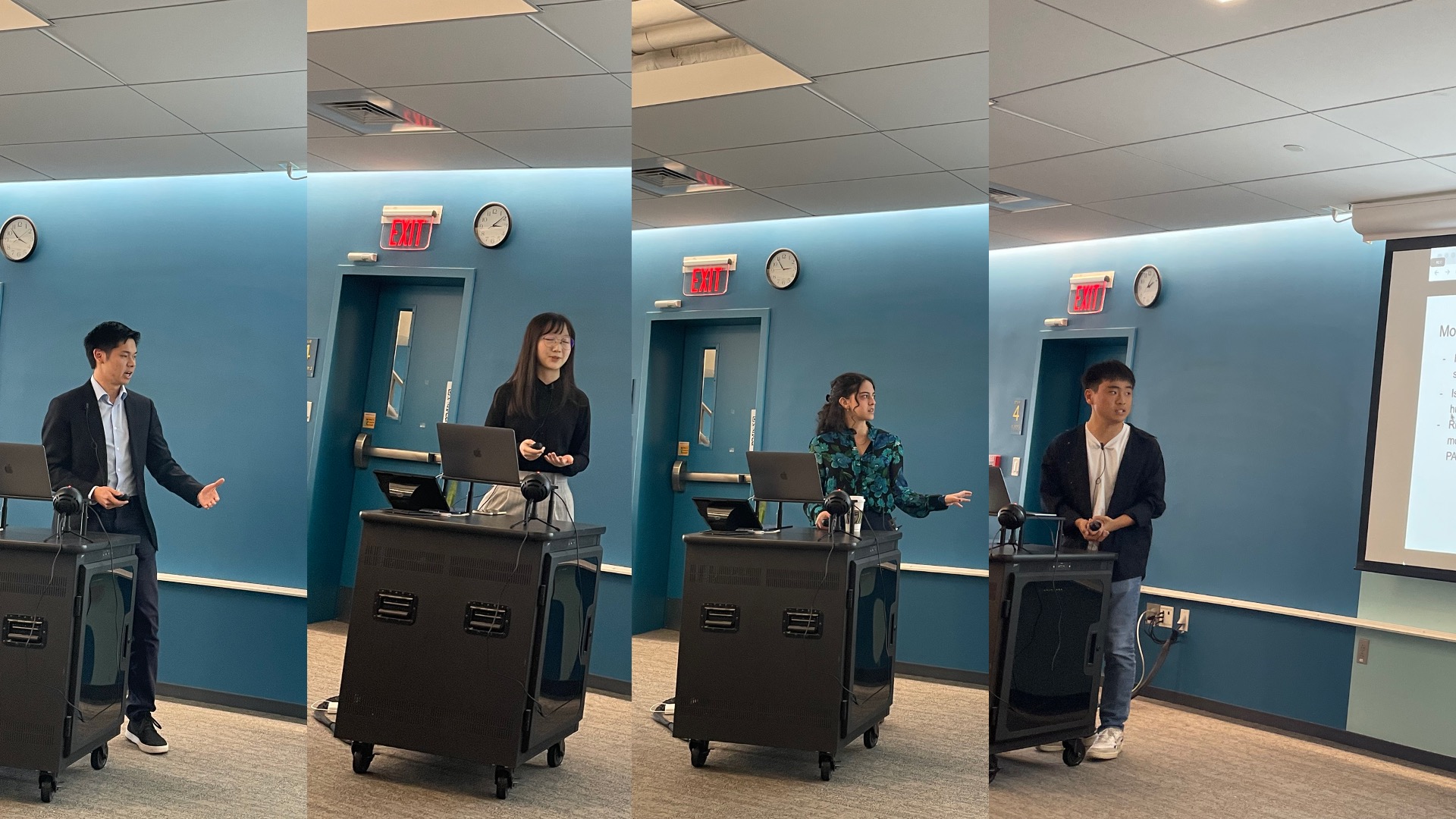 Singh Lab URAs present their CompBio Seniors Thesis project (April, 2023): (L-R) Alex Le, Yuan Pu, Deniz Touruner, and David Lee