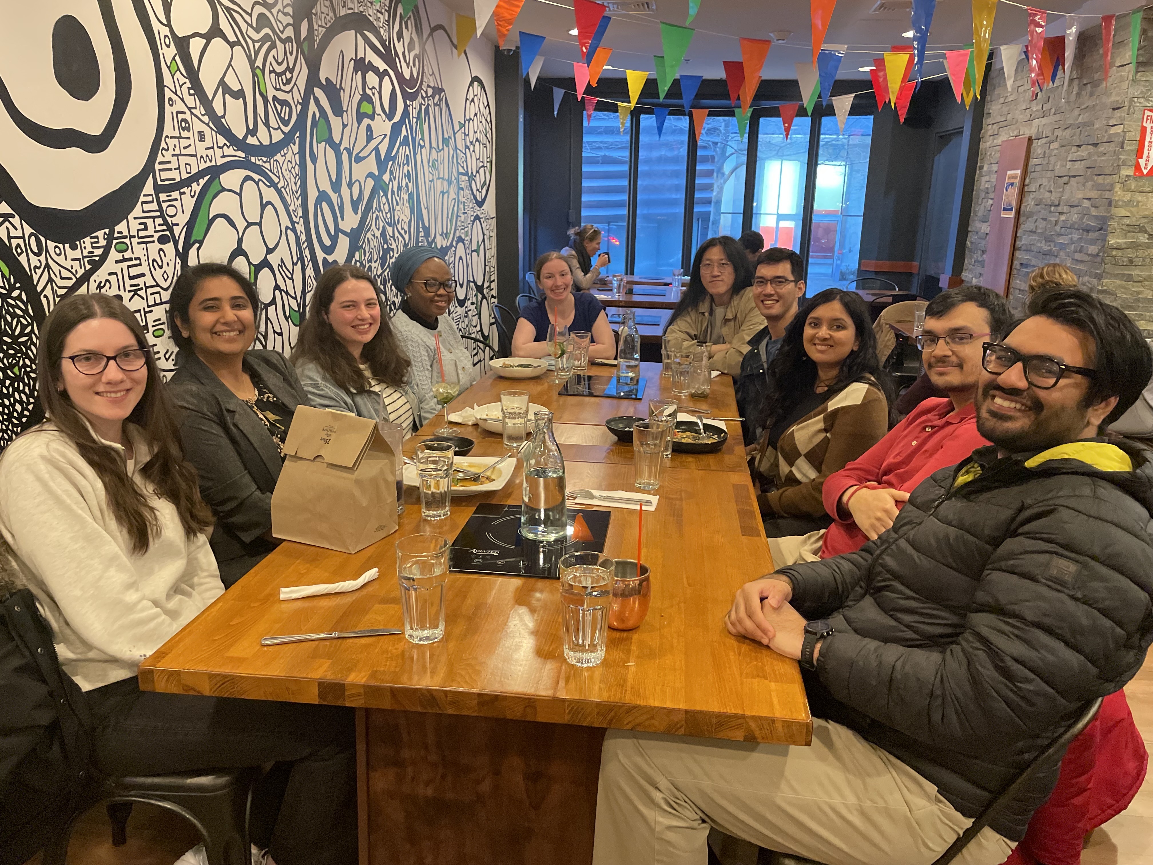 Dinner with the graduate students, March 2025 (Clockwise): Ioanna Gemou, Ritambhara Singh, Michal Golovanevsky, Amina Abdullahi, Whitney Sloneker, Jiaqi Zhang, Tuan Pham, Ananya Pavuluri, Atishay Jain, Ghulam Murtaza